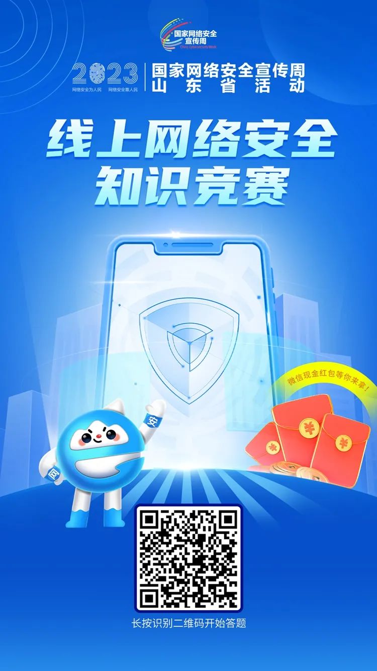 為面向廣大網(wǎng)民普及網(wǎng)絡(luò)安全知識引導(dǎo)網(wǎng)民樹立正確網(wǎng)絡(luò)安全觀念,提升網(wǎng)民防護(hù)意識,2023國家網(wǎng)絡(luò)安全宣傳周山東省活動,線上網(wǎng)絡(luò)安全知識競賽即將上線,輕松答題贏紅包,答題活動時(shí)間為9月10日—17日,微信掃描下方二維碼即可進(jìn)入?yún)⑴c。